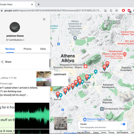 Reflecting on the dominance of Google Maps in the way that it profoundly shapes the perception of a place, the two artists have created an intervention on Maps, challenging what is allowed to be mapped and how, as well as the uniformity of information. By creating a ‘ghost’ gmail account called Potamos Ilissos (the river Ilissos) they trace the route of the river along the map, by creating pins as Landmarks. These pins correspond to the places where they have been together, and contain images, thoughts, emotions, and memories in the form of descriptions, reviews and star ratings, as a way to embed personal experience in the system.
